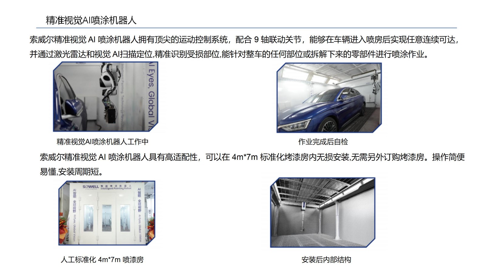 精準 AI 噴涂機器人(也稱九軸聯動噴漆機器人)基于高精度機器視覺 AI 人工智能算法智能感知與位姿估計系統,在三維空間協同6軸機器臂對目標車輛進行 360 度無死角自適應噴涂。通過 3D 視覺 AI掃描定位技術,可精準識別待噴漆區域,支持整車各部位的 A面(外觀表面)噴涂,多件連噴以及拆解零部件的獨立噴涂作業。設備具備高度適配性,兼容標準化烤漆房安裝,支持新型烤房一體化集成同時可定制適配專屬烤房尺寸。操作界面友好,部署快捷方便。