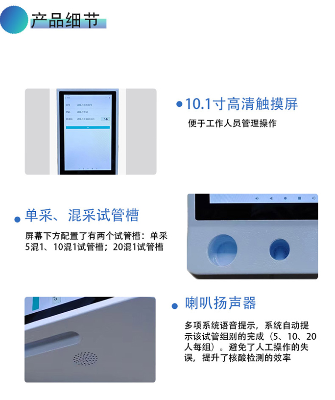 核酸碼采集一體機(jī)配置有高清攝像或二維碼掃描儀、試管槽、10寸主屏及6寸副屏,擁有音視頻輸出、自助掃碼等功能,實(shí)現(xiàn)與核酸系統(tǒng)無(wú)縫銜接并實(shí)時(shí)數(shù)據(jù)同步。支持單采和混采。由醫(yī)護(hù)人員錄入試管條碼后,被采樣人只需要提前打開(kāi)核酸碼或健康碼,置于機(jī)器上方掃碼,僅用4秒即可完成登記,無(wú)需專人確認(rèn),...