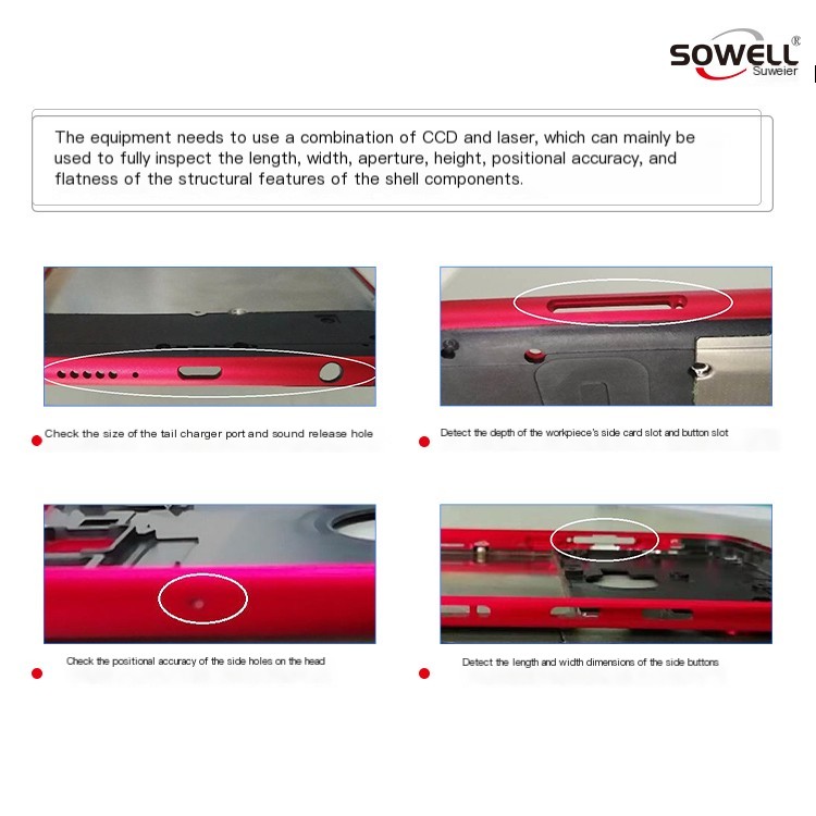 Use machine vision equipment to detect the length, width, aperture, height, position, and flatness of the phone case battery cover, mark defects, and classify qualified and defective products.